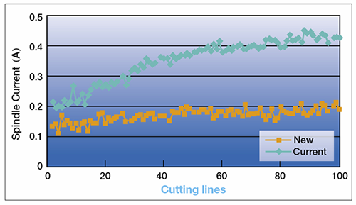 上图为在LiTaO3晶圆加工过程中测得的电流值。ZHFX系列主轴的电流值并没有随着切割线数量的增加而上升,可实现稳定加工。