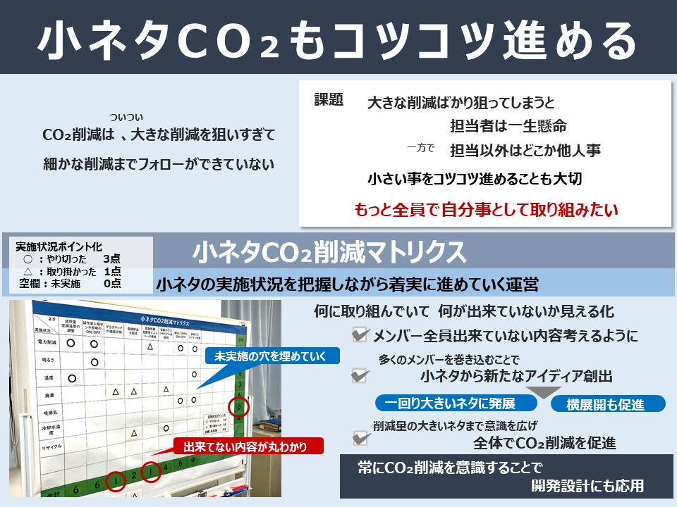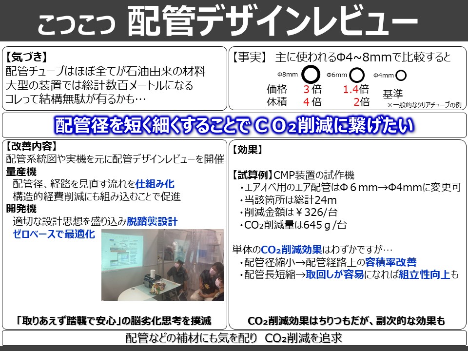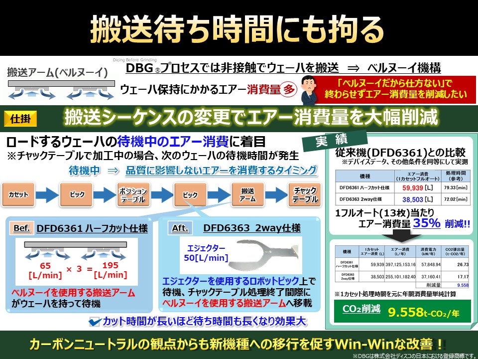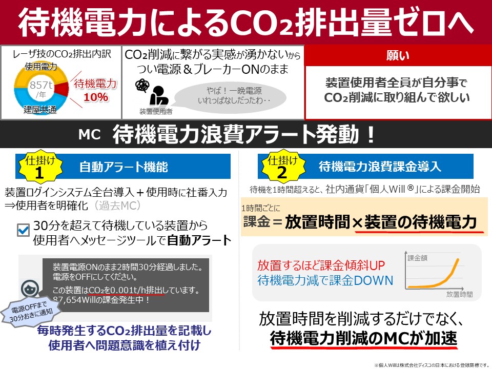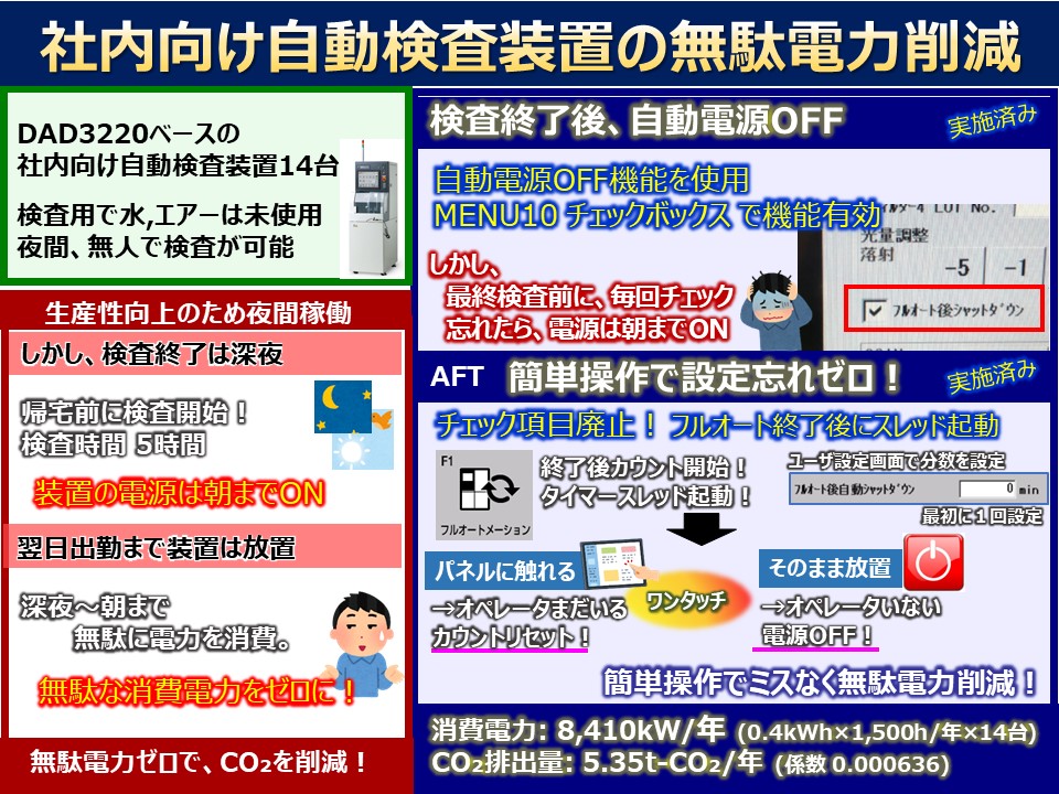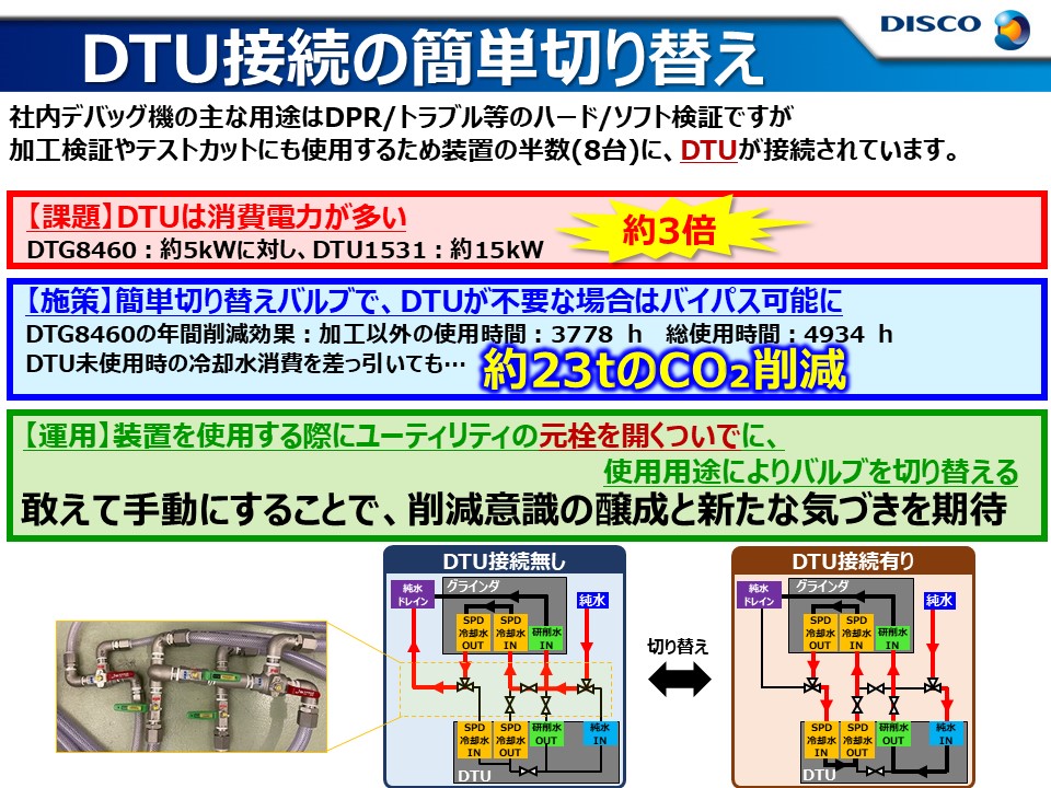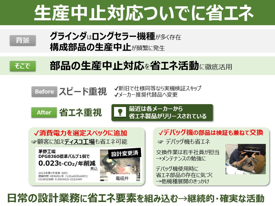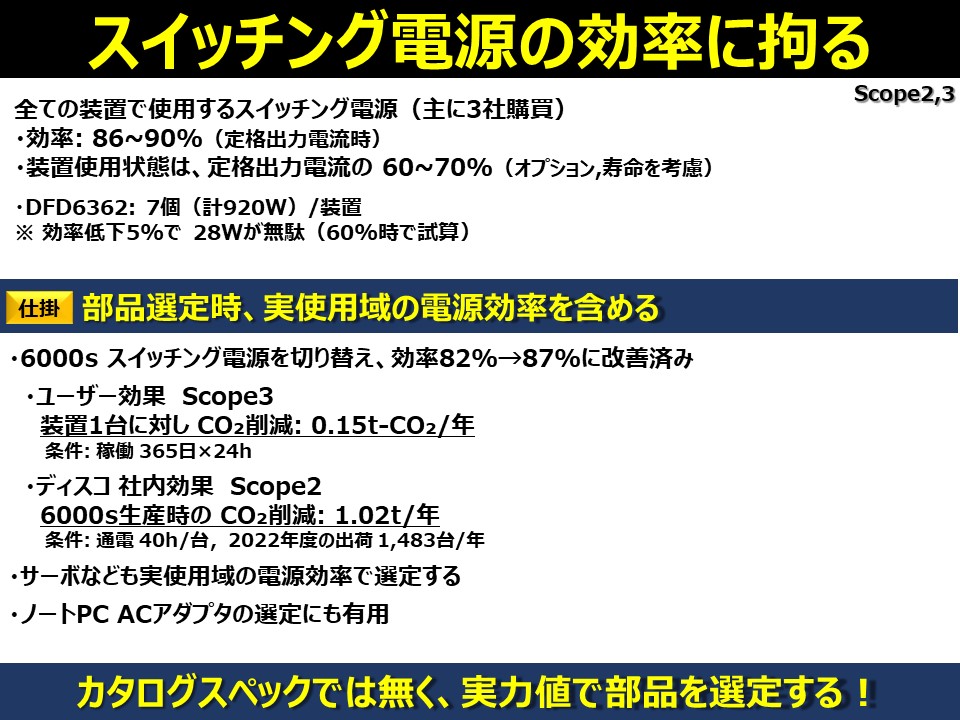 ディスコでは「PIM」と称する改善活動を全社的におこなっています。この活動に、全技術部⾨が参加する「カーボンニュートラル」のカテゴリーを設け、開発におけるエネルギー効率の向上や、製品管理の⼯夫による省エネなど、さまざまな改善策を共有、⽔平展開しています。PIMは対戦形式でおこなわれるため、「勝ちたい」というマインドが⾃ずと⽣まれ、それがより効果的な⼯夫を⽣み出す熱意につながっています。実例の⼀部を、対戦で使⽤された資料の形式で紹介します。