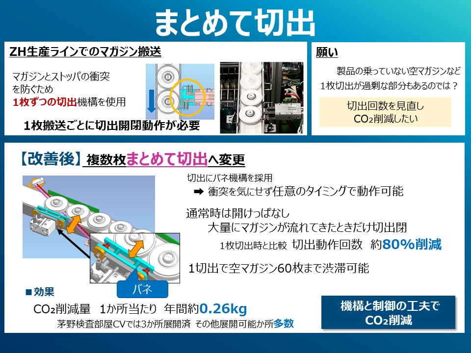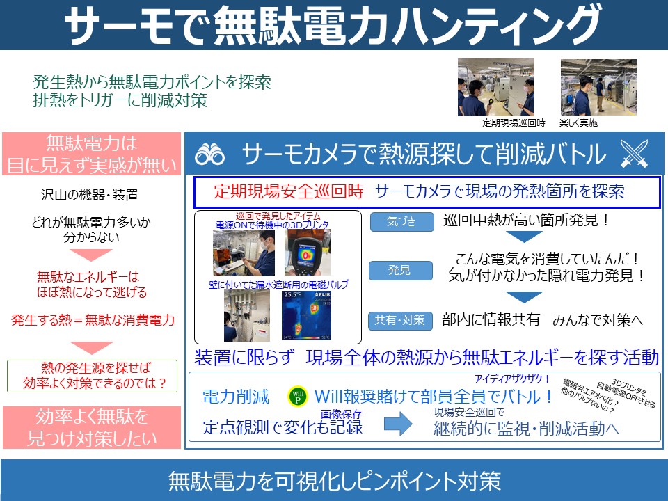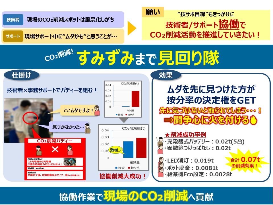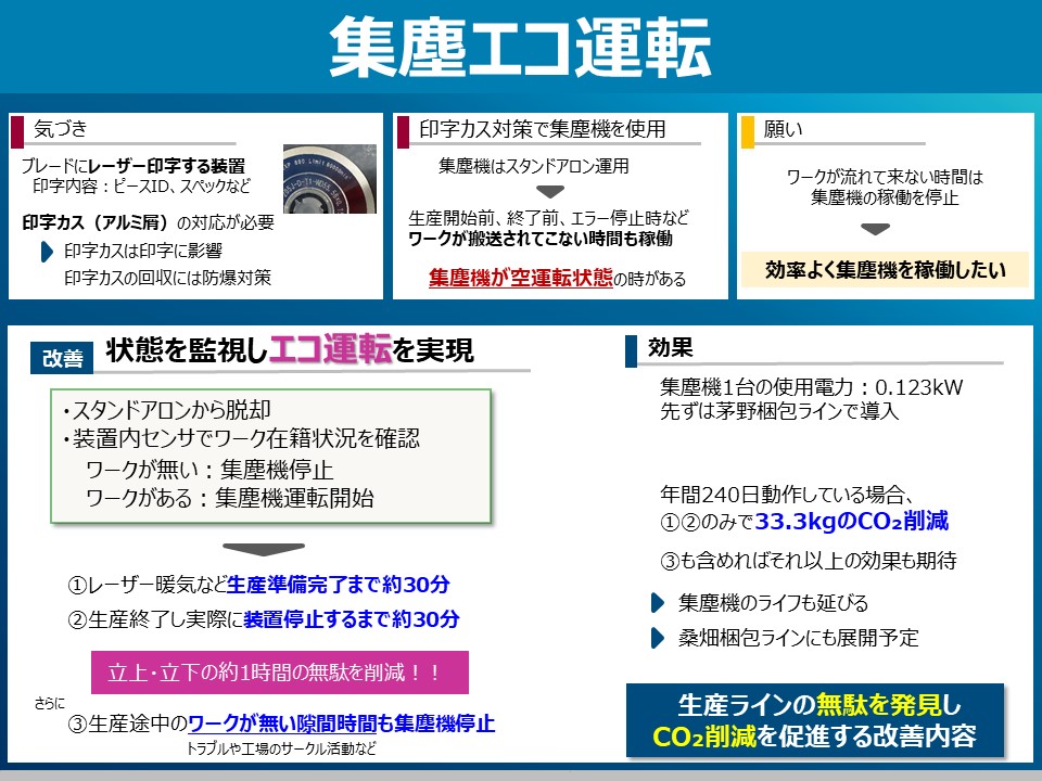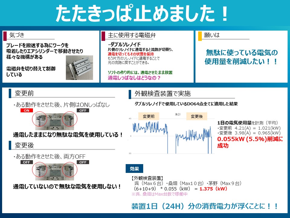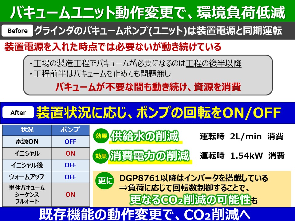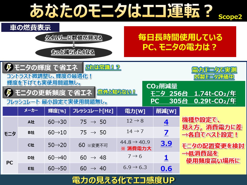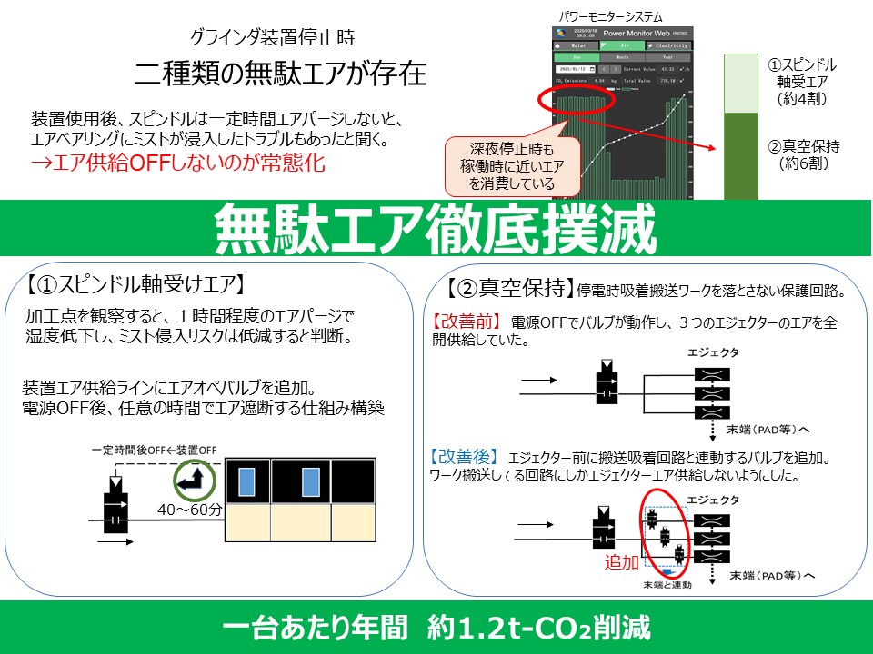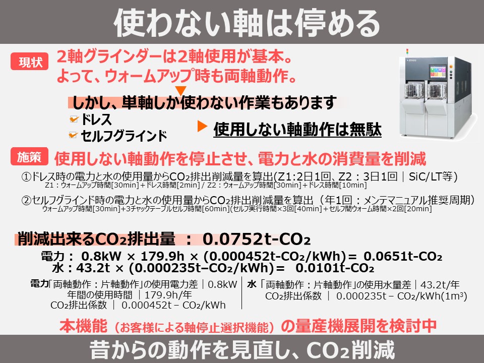 ディスコでは「PIM」と称する改善活動を全社的におこなっています。この活動に、全技術部⾨が参加する「カーボンニュートラル」のカテゴリーを設け、開発におけるエネルギー効率の向上や、製品管理の⼯夫による省エネなど、さまざまな改善策を共有、⽔平展開しています。PIMは対戦形式でおこなわれるため、「勝ちたい」というマインドが⾃ずと⽣まれ、それがより効果的な⼯夫を⽣み出す熱意につながっています。実例の⼀部を、対戦で使⽤された資料の形式で紹介します。
