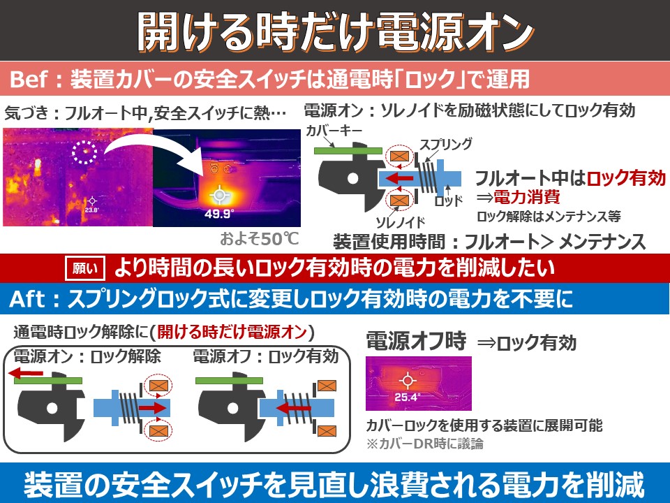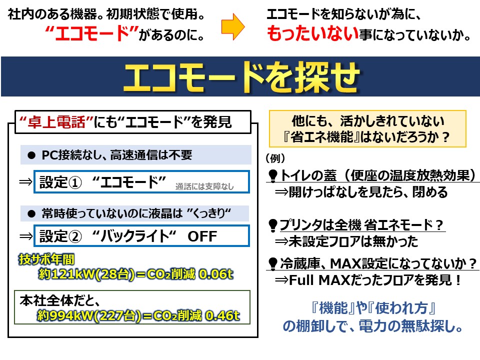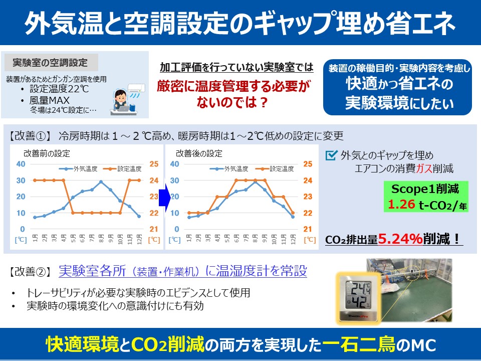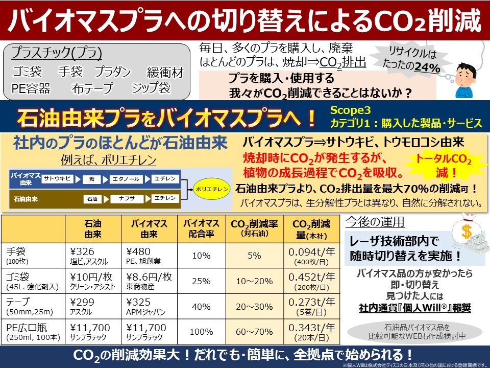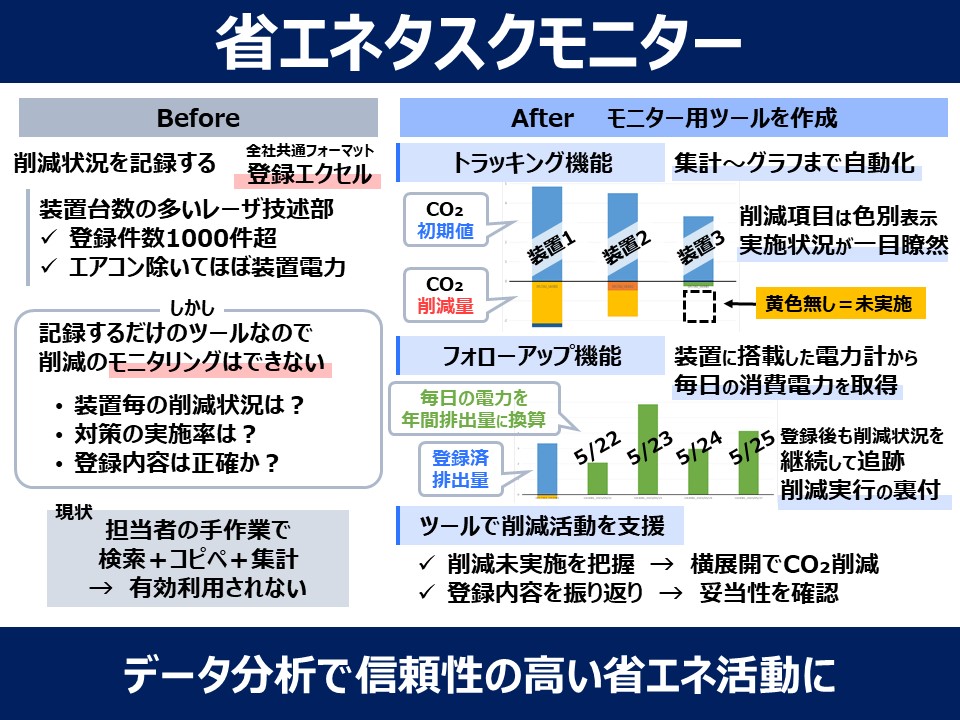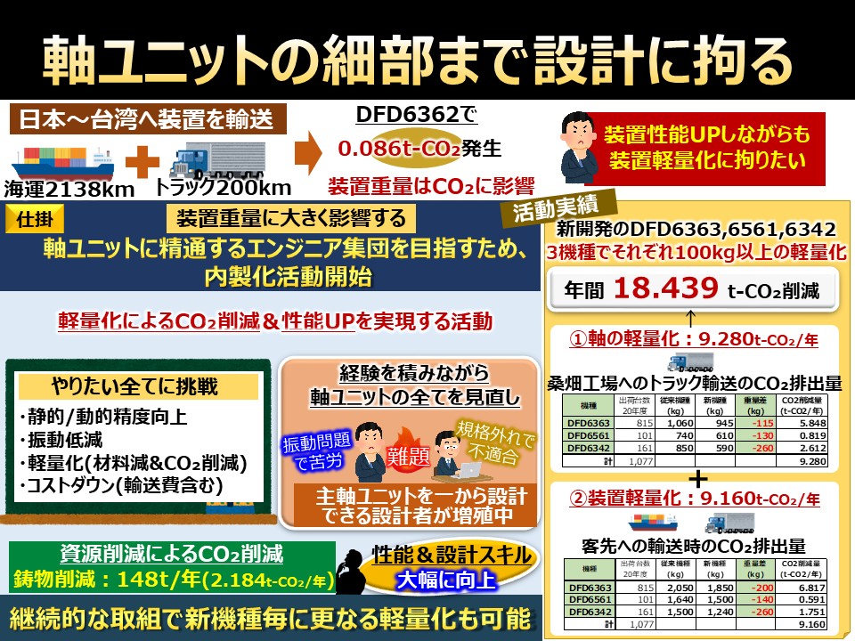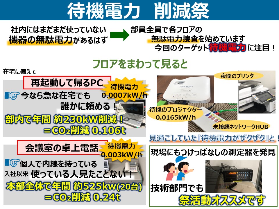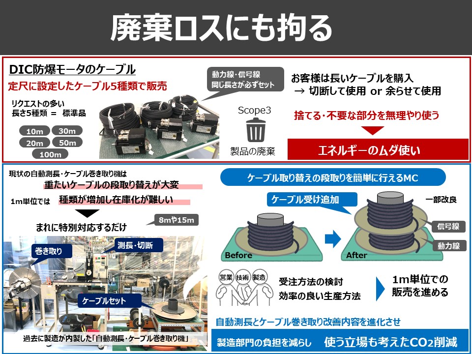 ディスコでは「PIM」と称する改善活動を全社的におこなっています。この活動に、全技術部⾨が参加する「カーボンニュートラル」のカテゴリーを設け、開発におけるエネルギー効率の向上や、製品管理の⼯夫による省エネなど、さまざまな改善策を共有、⽔平展開しています。PIMは対戦形式でおこなわれるため、「勝ちたい」というマインドが⾃ずと⽣まれ、それがより効果的な⼯夫を⽣み出す熱意につながっています。実例の⼀部を、対戦で使⽤された資料の形式で紹介します。