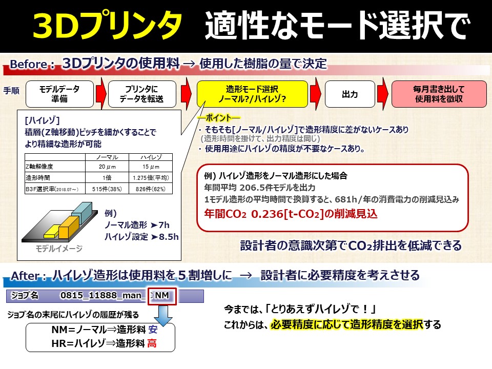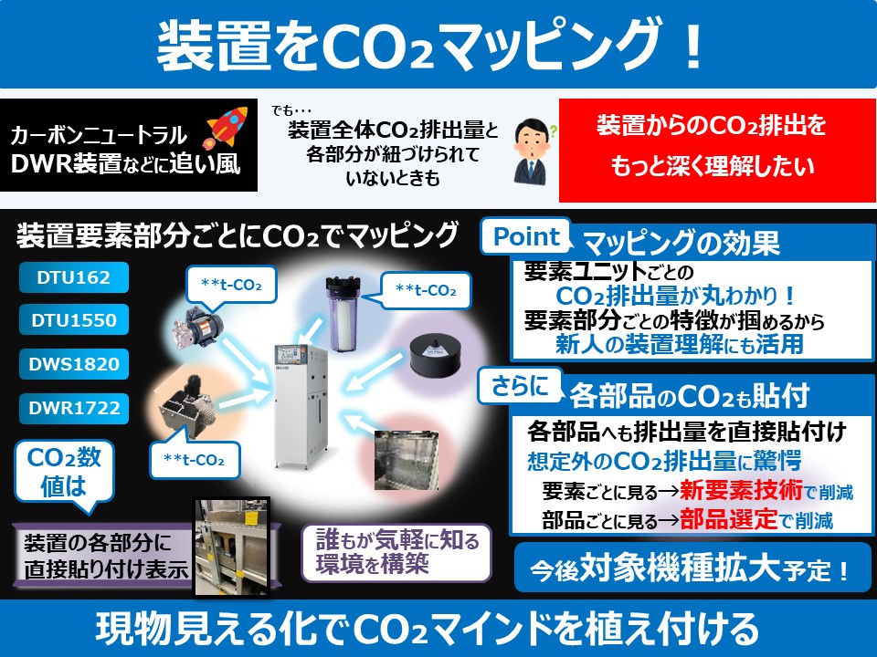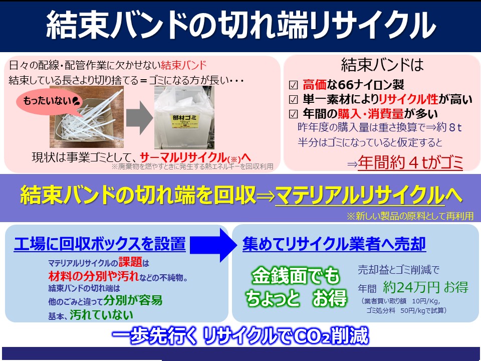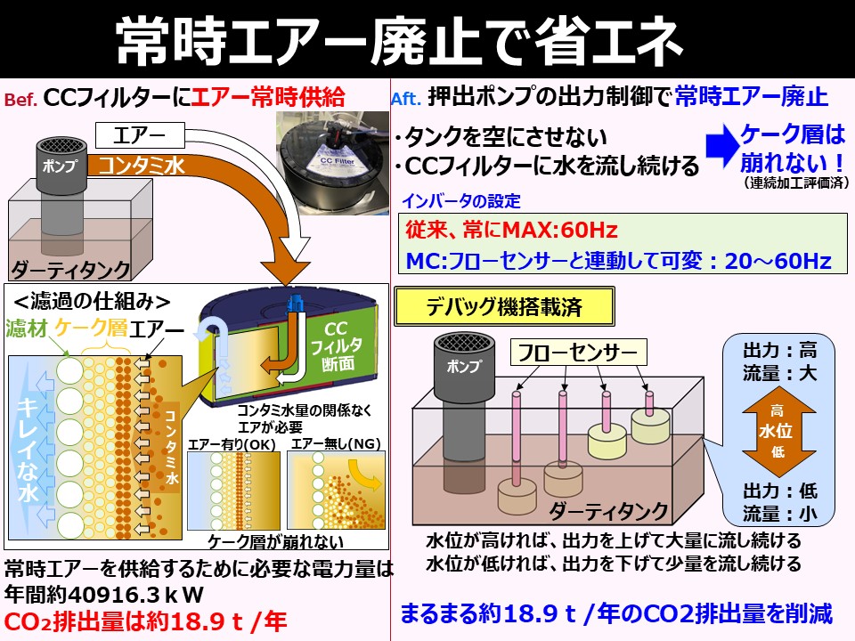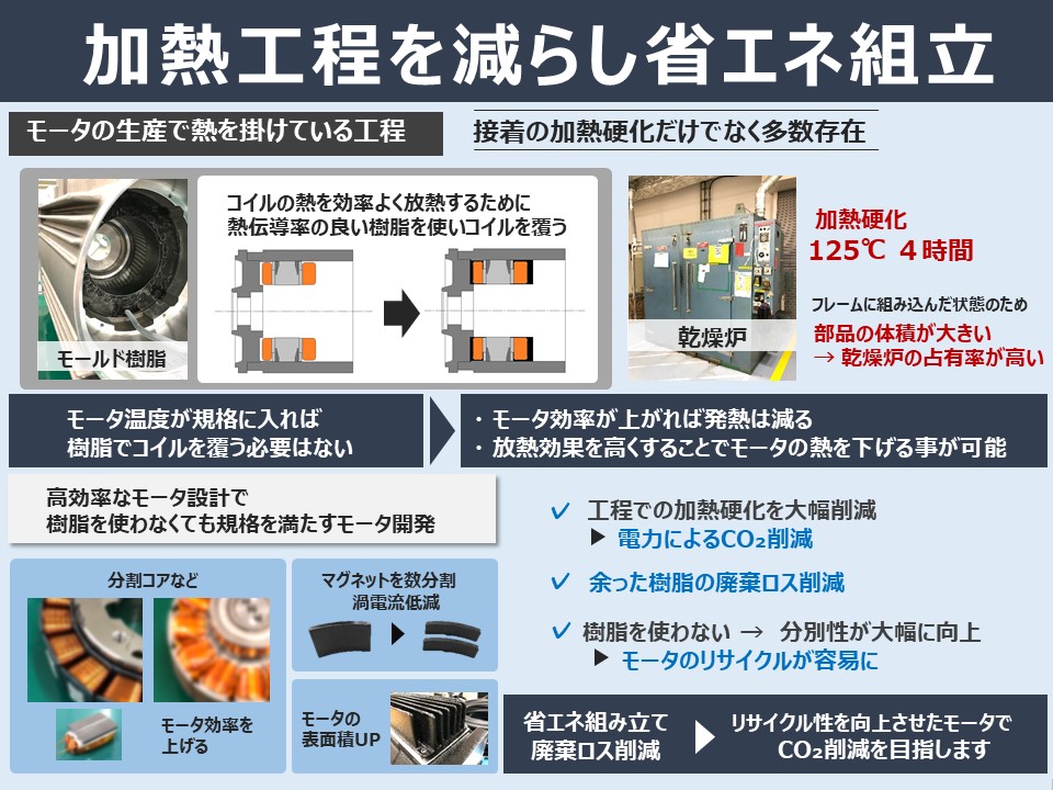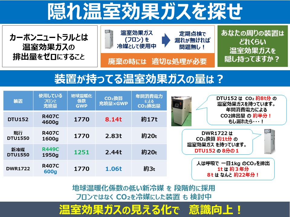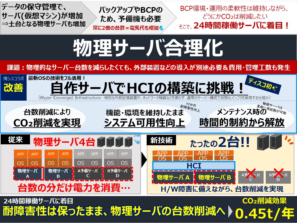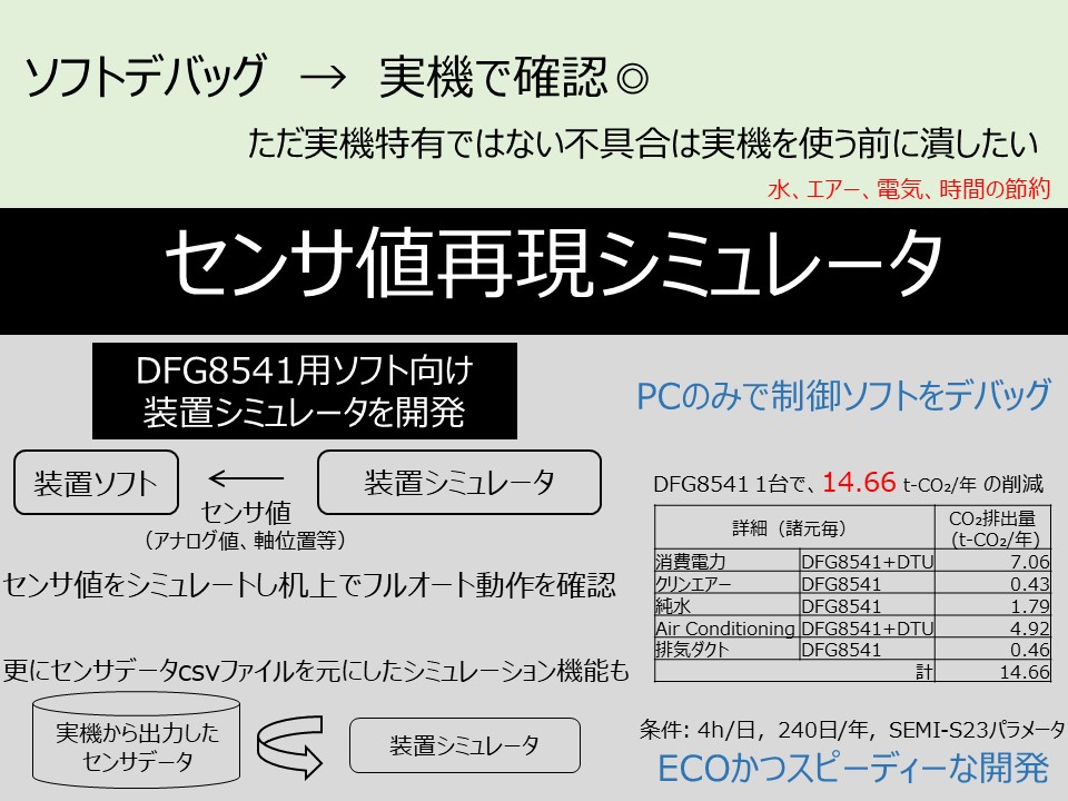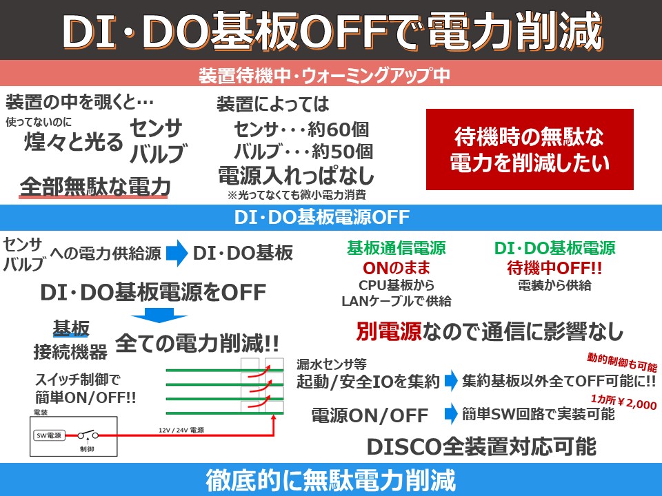 ディスコでは「PIM」と称する改善活動を全社的におこなっています。この活動に、全技術部⾨が参加する「カーボンニュートラル」のカテゴリーを設け、開発におけるエネルギー効率の向上や、製品管理の⼯夫による省エネなど、さまざまな改善策を共有、⽔平展開しています。PIMは対戦形式でおこなわれるため、「勝ちたい」というマインドが⾃ずと⽣まれ、それがより効果的な⼯夫を⽣み出す熱意につながっています。実例の⼀部を、対戦で使⽤された資料の形式で紹介します。
