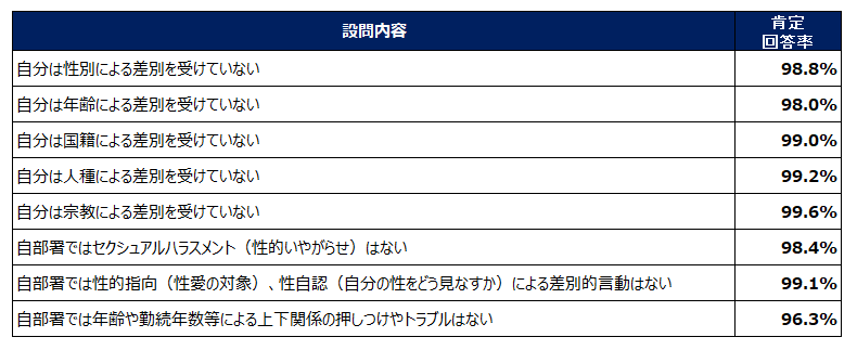多様性に関する各設問の肯定回答率は、下表のとおりです。